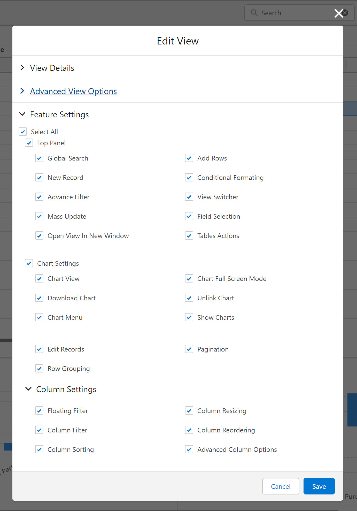 Ability to turn ON or OFF view features based on requirements to restrict users from accessing certain tables features or user actions.