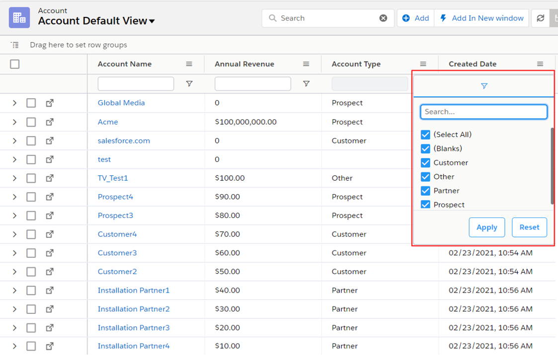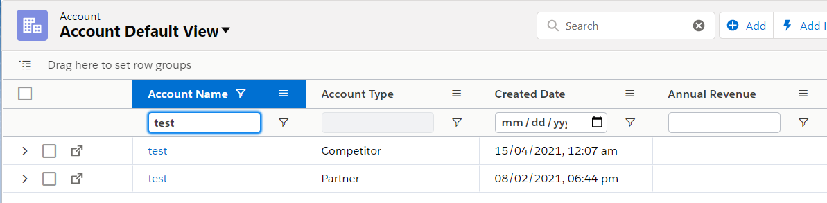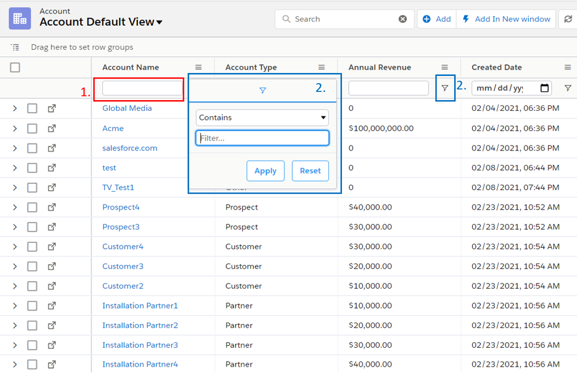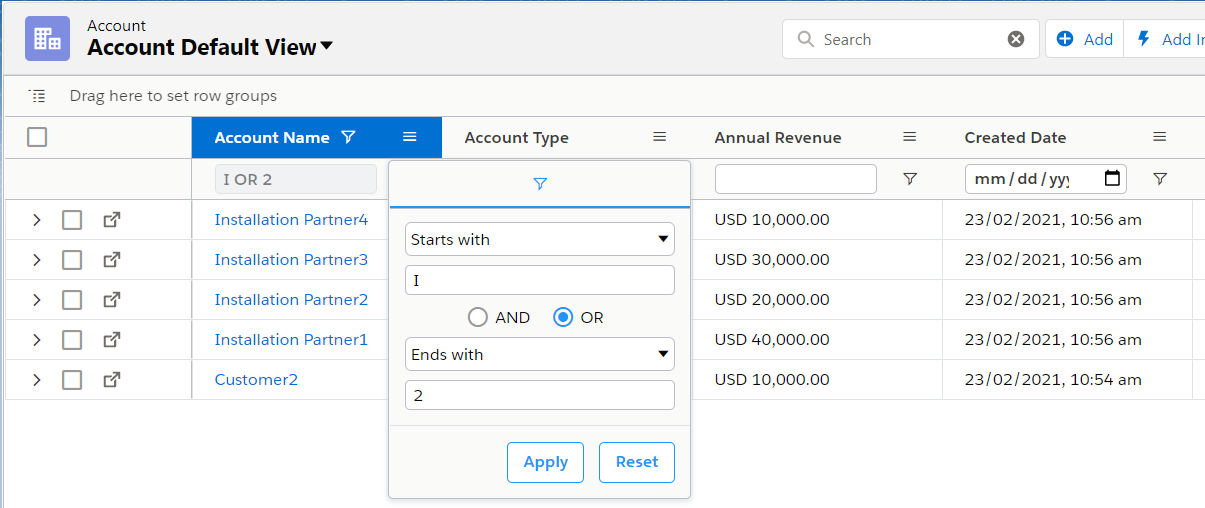 2.Floating filter: - We can do a conditional filter using the floating filter like Annual revenue greater than 10000, Account Name equals test, etc.