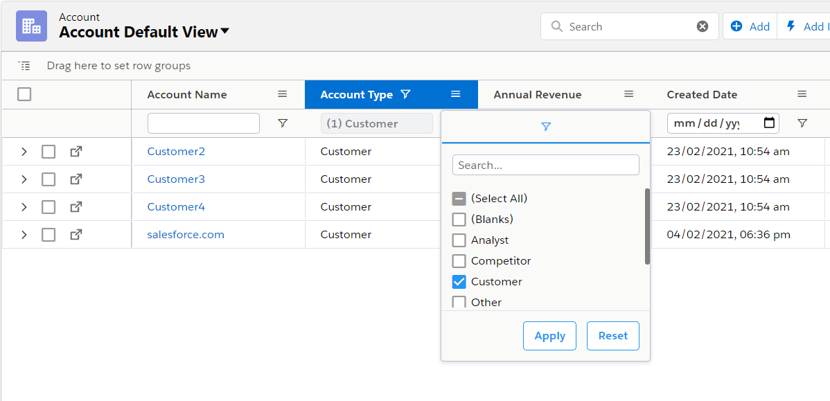 If we want to select only the customer account type in the above example, it will show only the record containing the account type customer.
