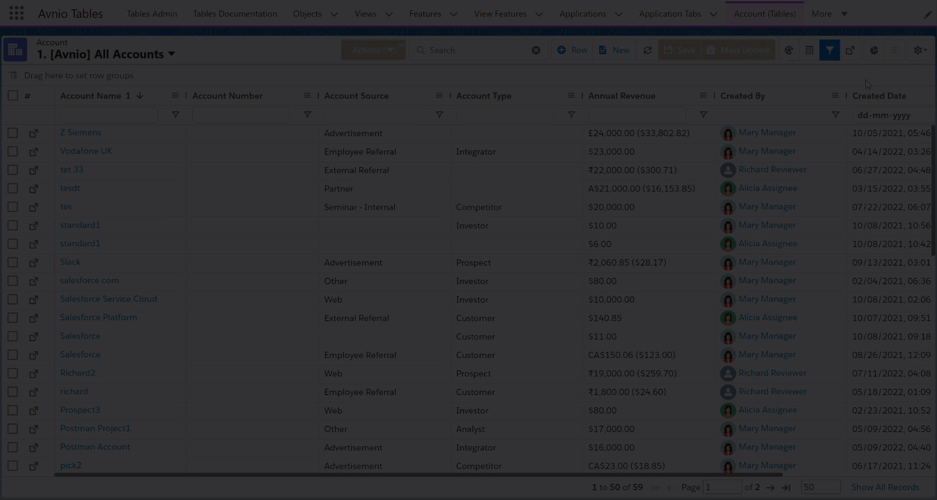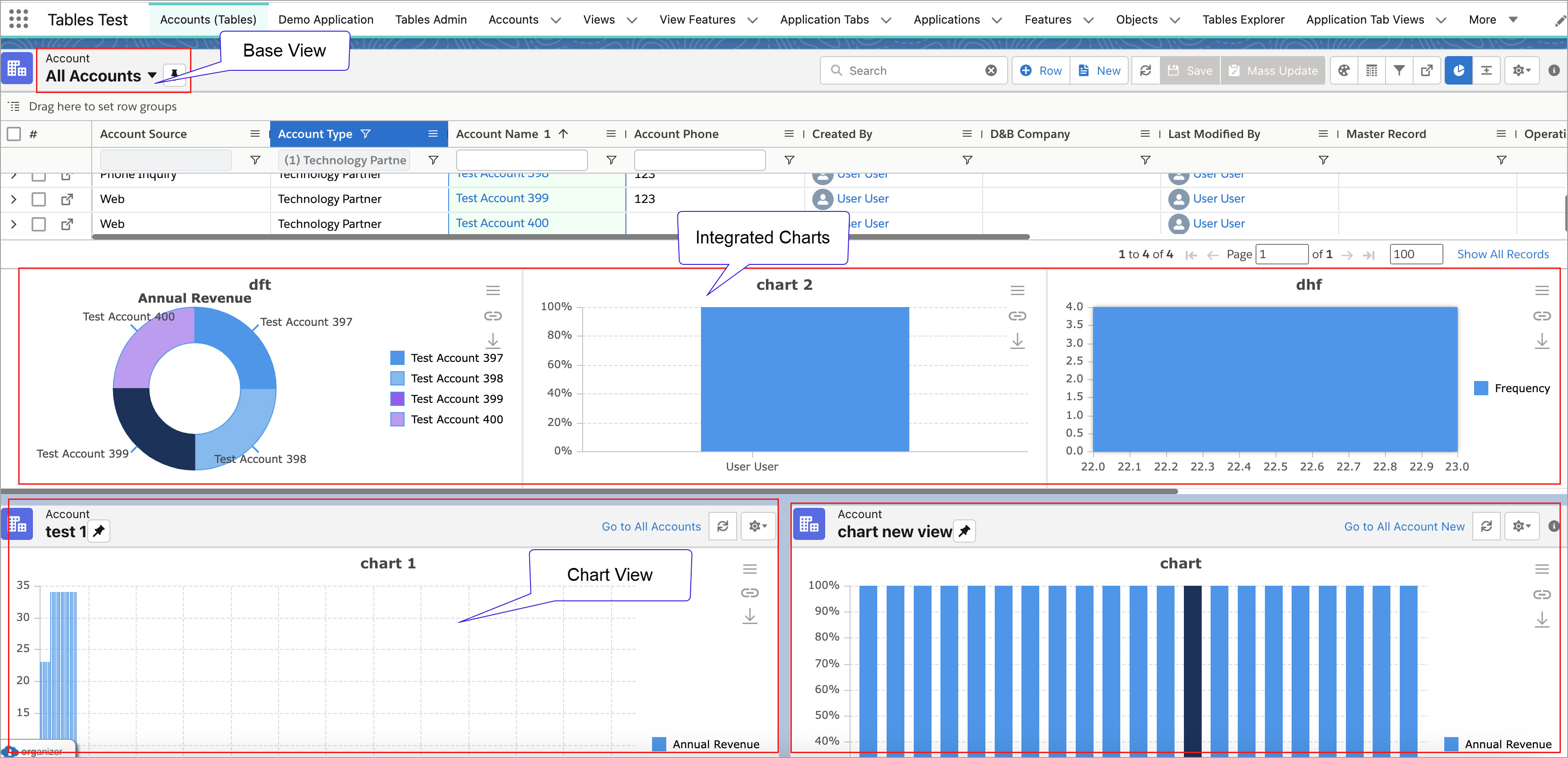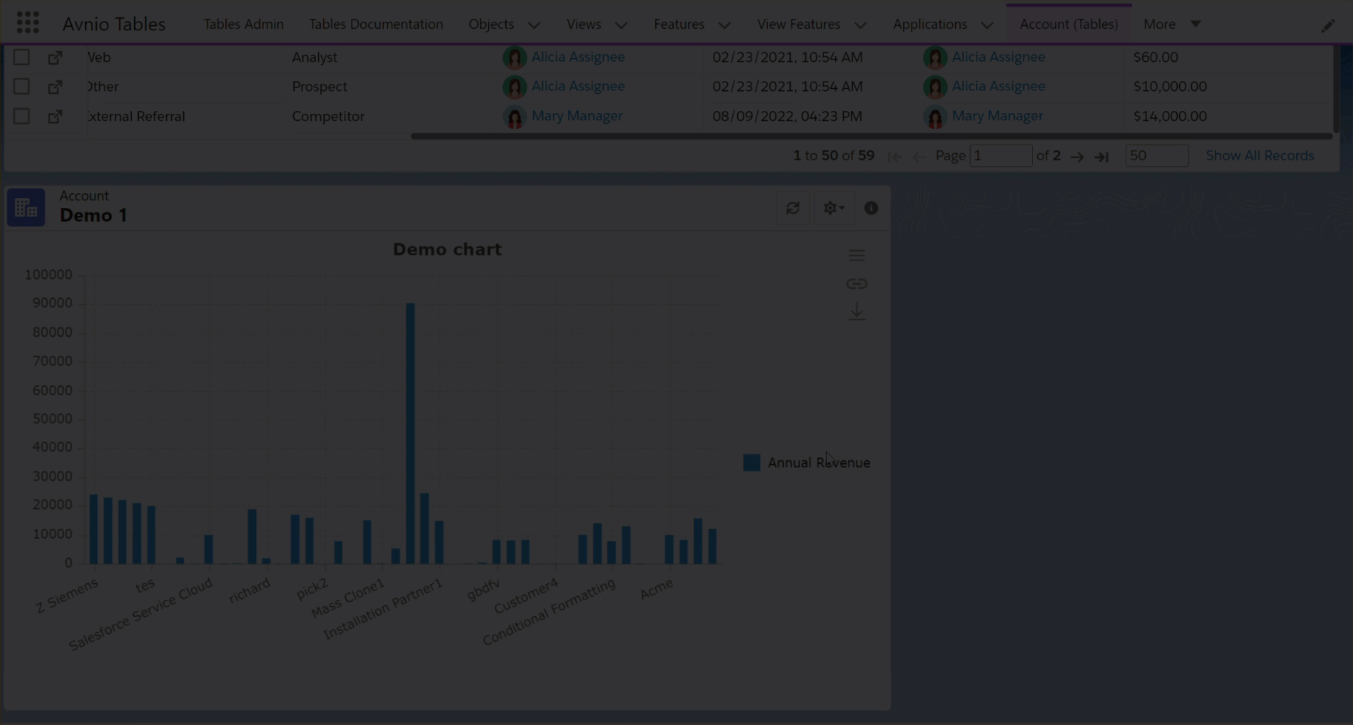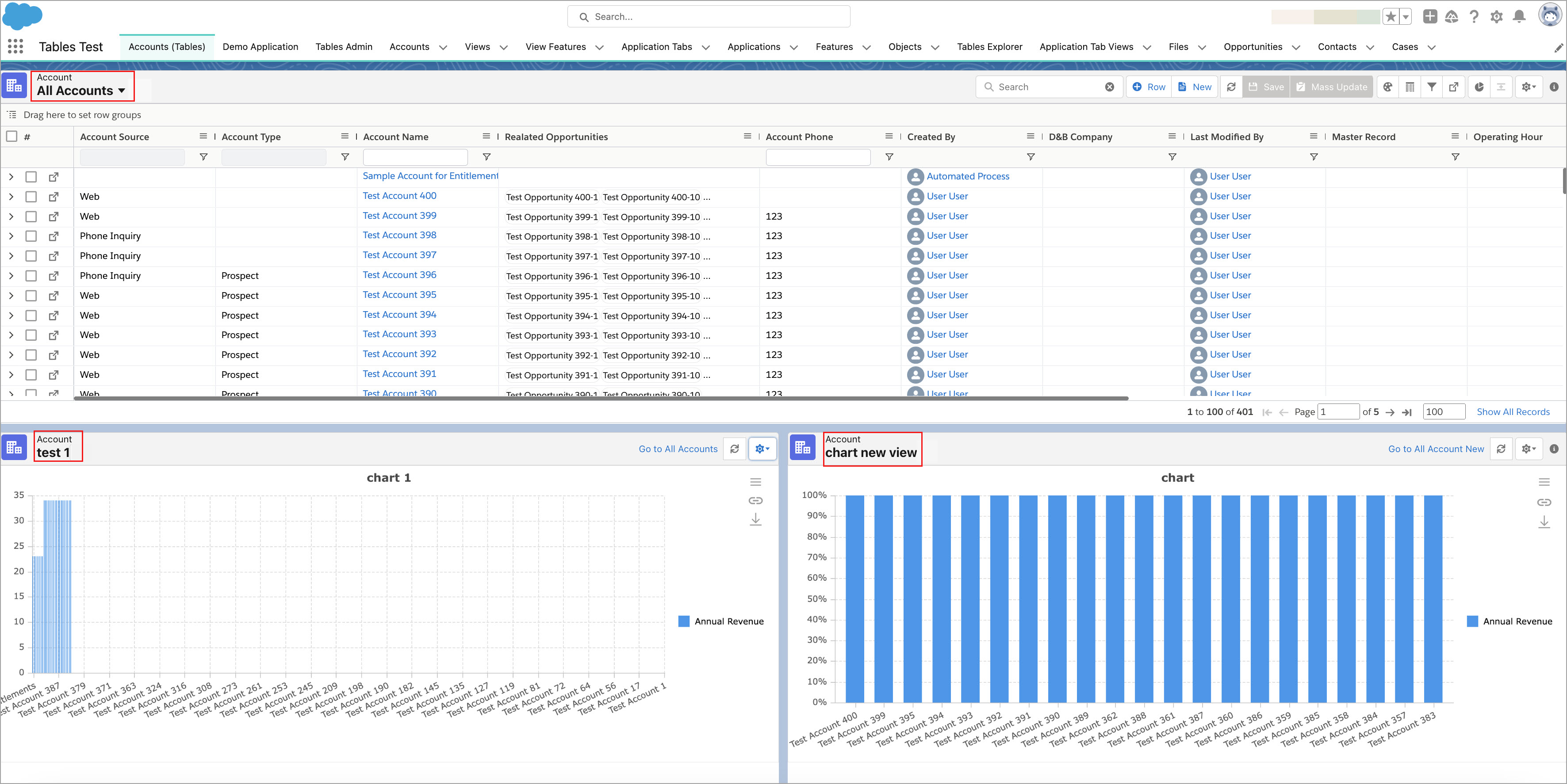 Load Multiple Tables | For a better user experience, user can now add multiple table components in a single lightning page. Various types of tables such as standard and custom object with default view as well as chart view can be loaded in a single page. ![]() Click to enlarge The default loading time is set to 3000ms, the user with the required permission can update it from Tables Configuration > Tables Loading Timeout. |