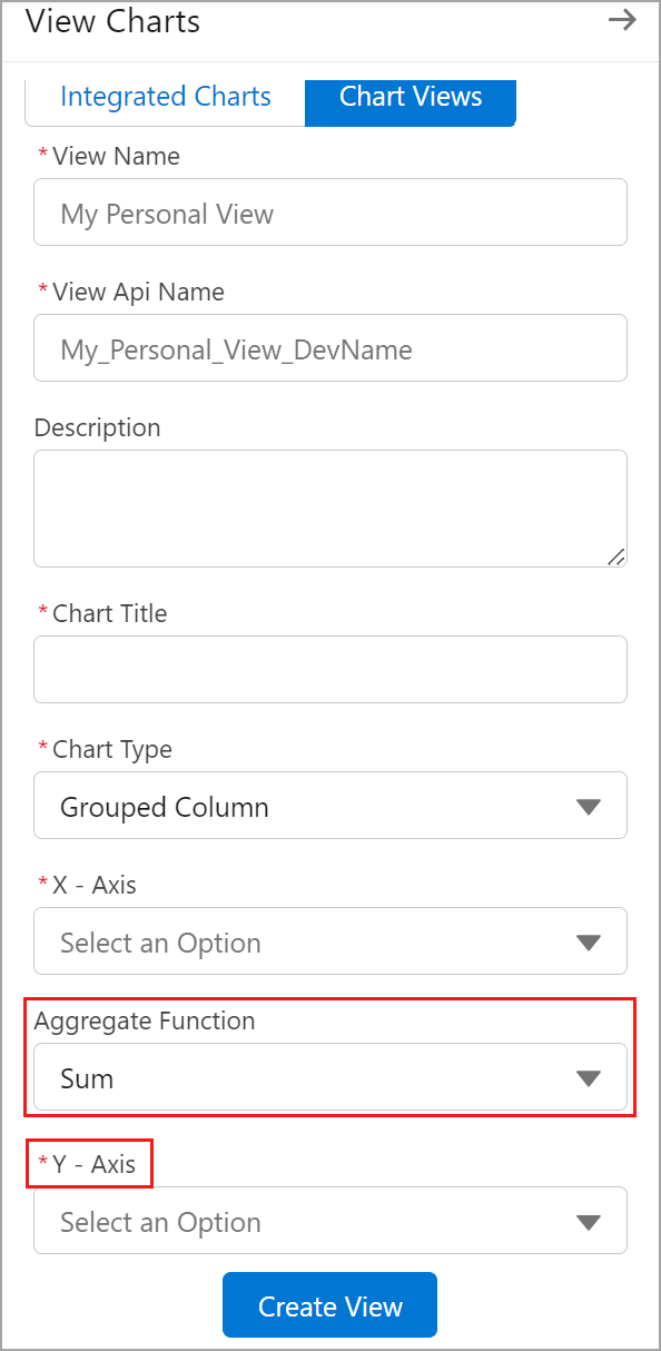 Mandatory Y-axis field | On creating a Chart View, when you select any value other than 'Count' from the Aggregate Function drop down, the system will now mark the Y-axis field with a mandatory(*) symbol. This indicates that the Y-axis field is required for creating a chart view. ![]() Click to enlarge If you select the value as Count, the Y-axis field will be hidden from the Chart View panel. |