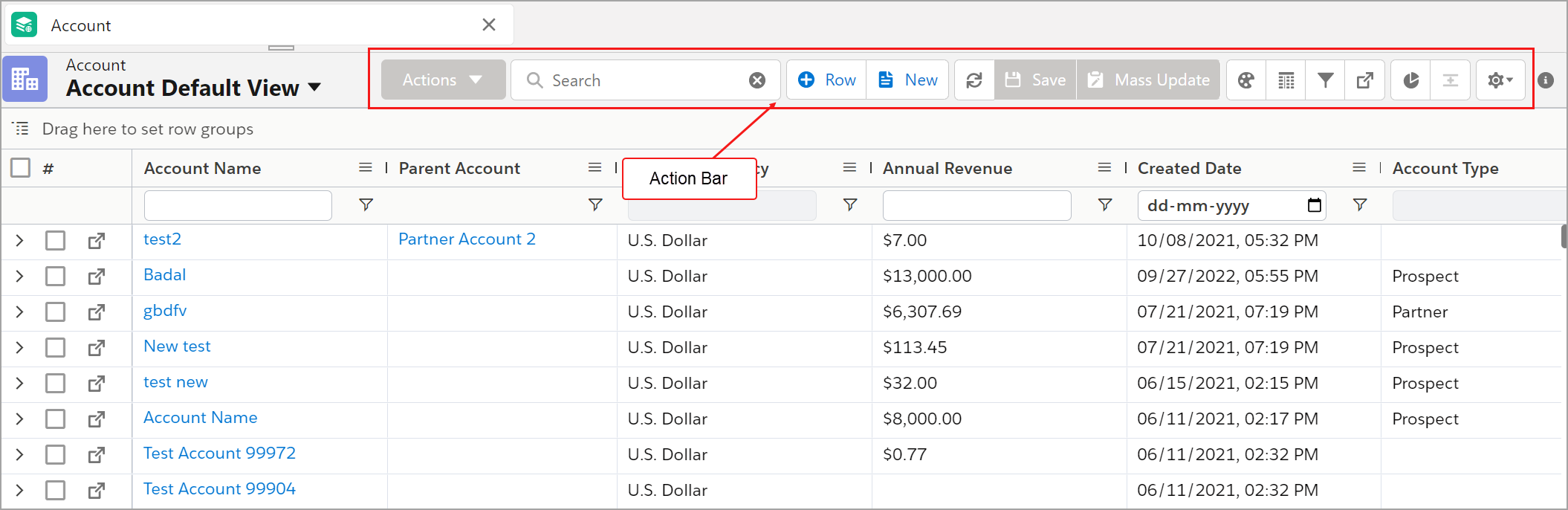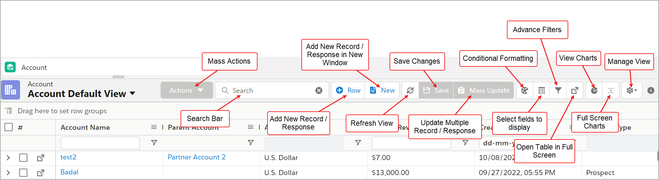 Advance Filter | ![]() | Use to apply an advance filter or relative filter. More info: Filter records with advance filter | Yes | Yes | Yes | Yes | Yes |