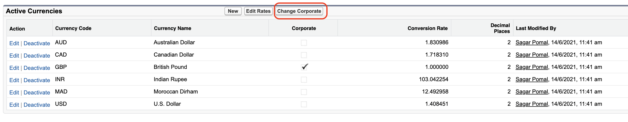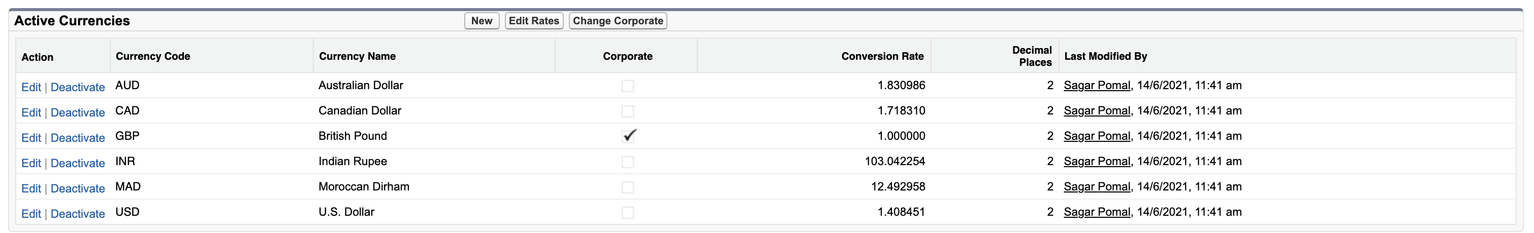 Once you activate multicurrency for your org, you can specify which currencies are supported by activating or deactivating them. No covert intelligence skills required, just a few clicks:
