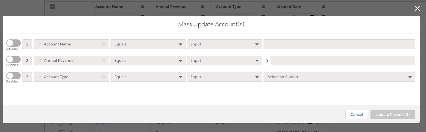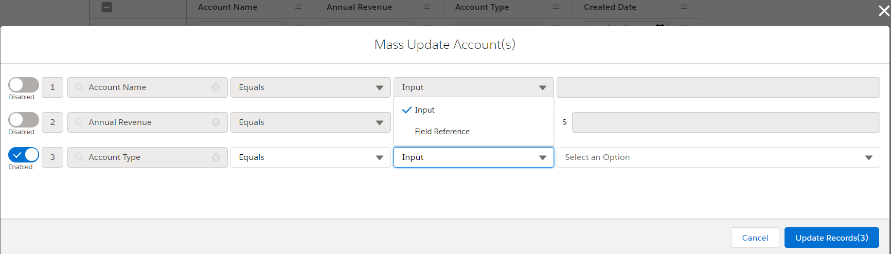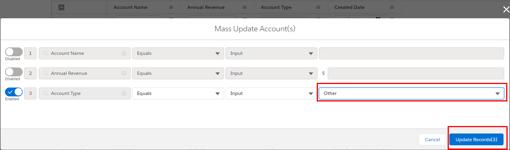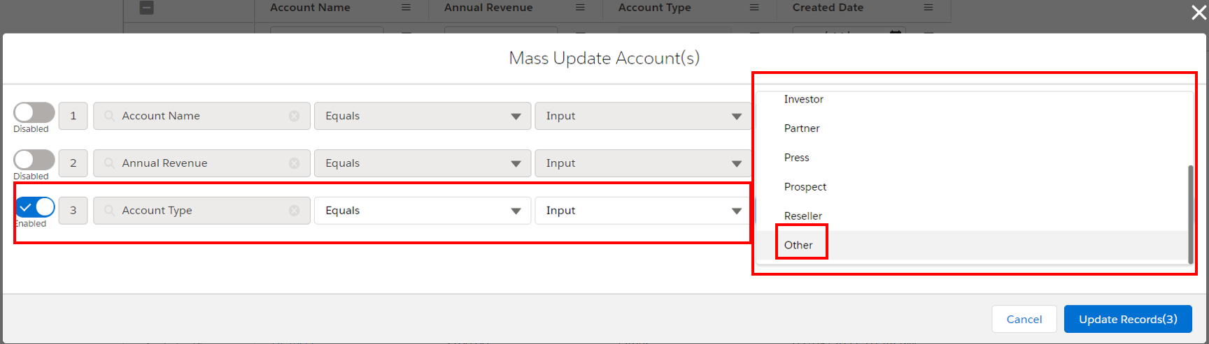 5. Suppose we have to change the Account type of selected records, then we have to enable the Account type filed on a pop-up menu. (Refer to below image)
