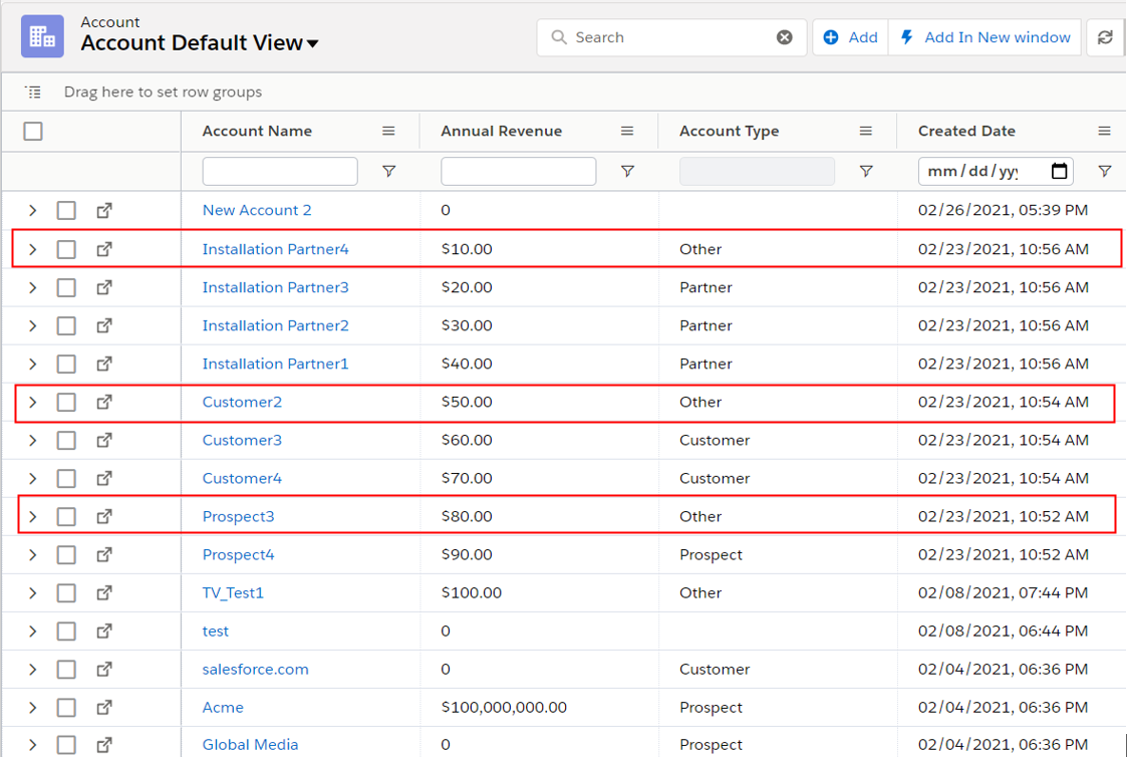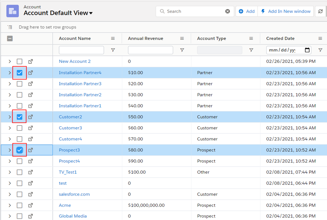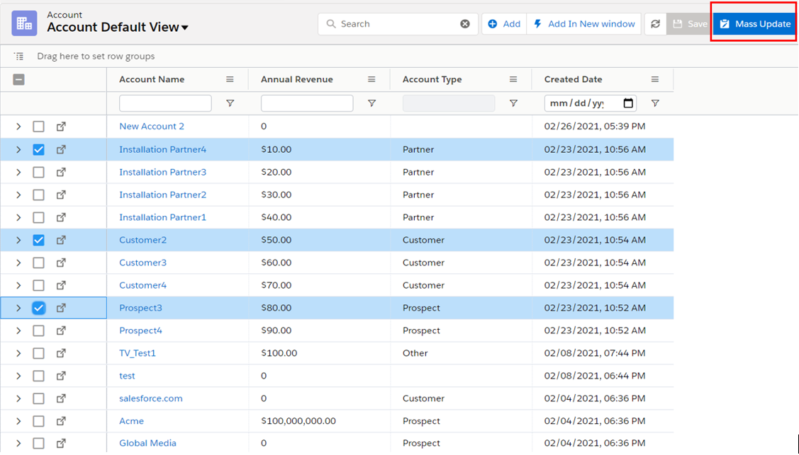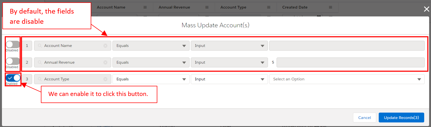 5. Suppose we have to change the Account type of selected records, then we have to enable the Account type filed on a pop-up menu. (Refer to below image)
