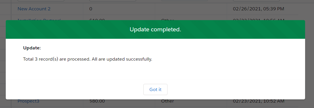 7. Select Other Account type and click on Update Records. It will show a success message if records are successfully updated.