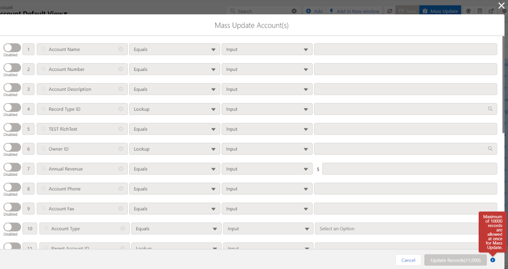 If we select more than 10000 records for the mass update, it will show the error message below.